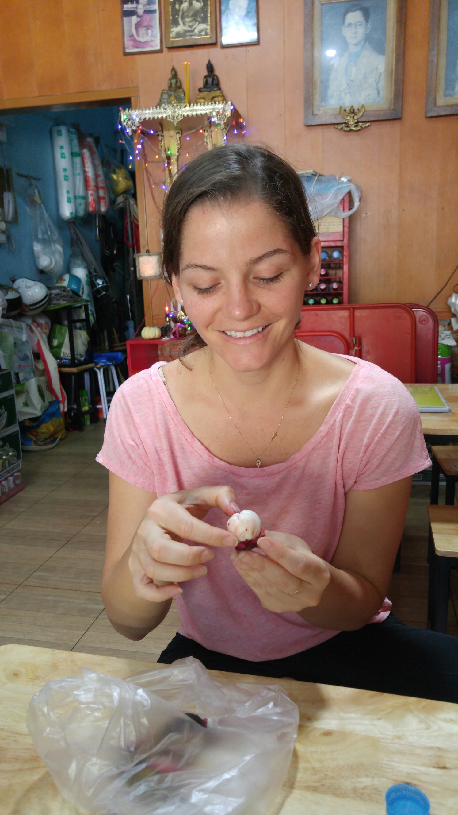 Jeanette’s quest in every market is too find mangosteen. We learned that they were out of season in Nong Chang, but that didn’t stop her. Here is what they look like; she was very excited to find this beauty.