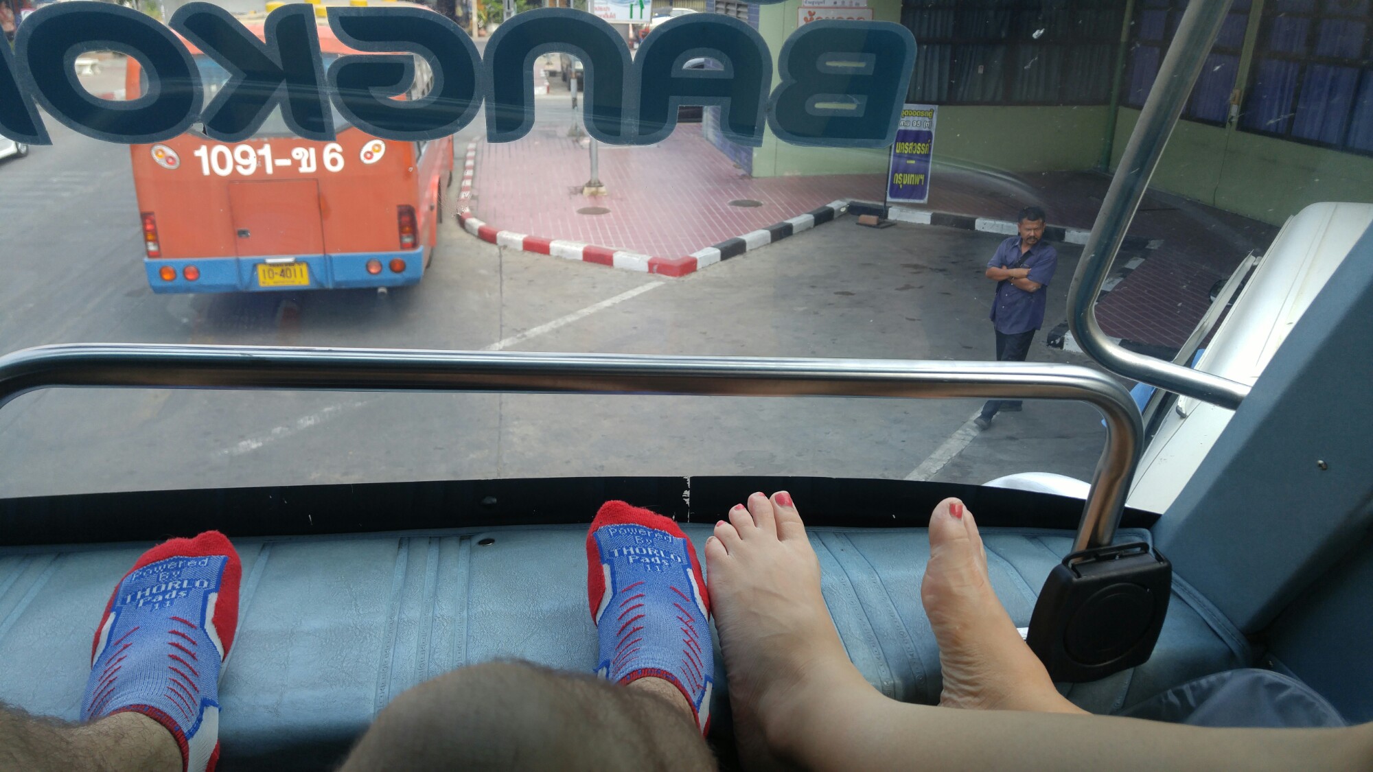 The bus from Nakhon Sawan to Chiang Mai was very comfortable – much more so than the one we took down to Chumphon for scuba diving.  There was enough space between the rows of seats that you could lean your seat back without crowding the person behind you. For the 7 hour trip, a ticket was 333 baht (or $9.50) a piece.  It was a double decker and Jeanette and I had front row seats on the second level.