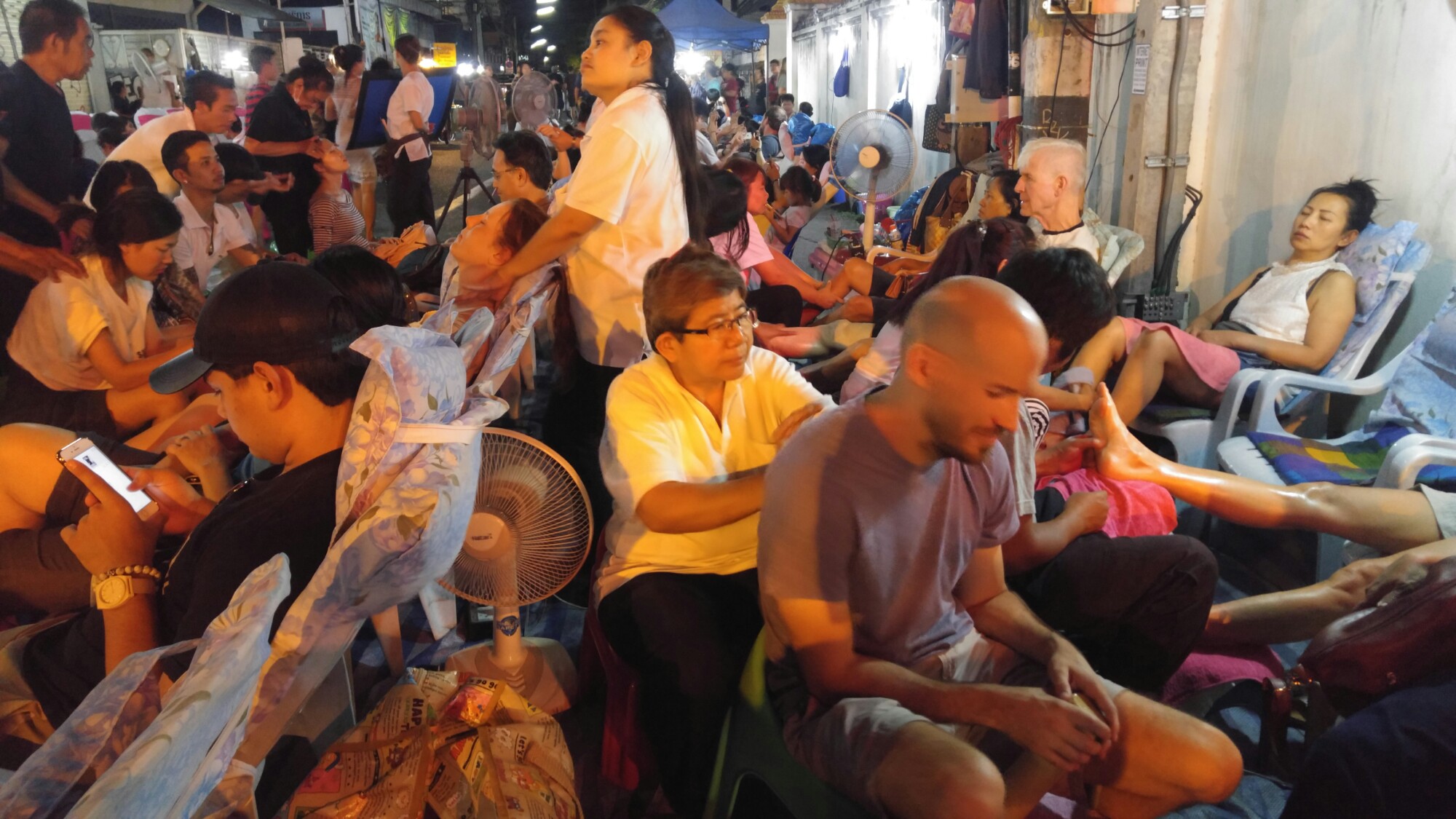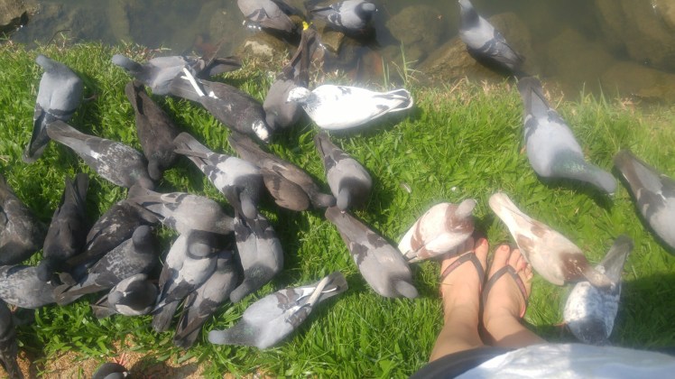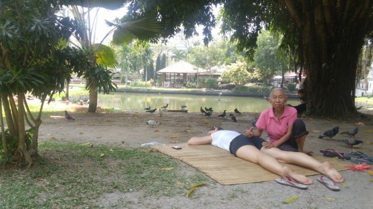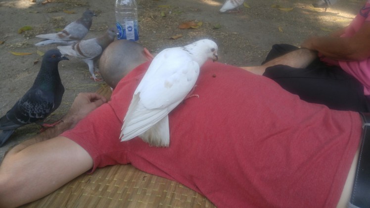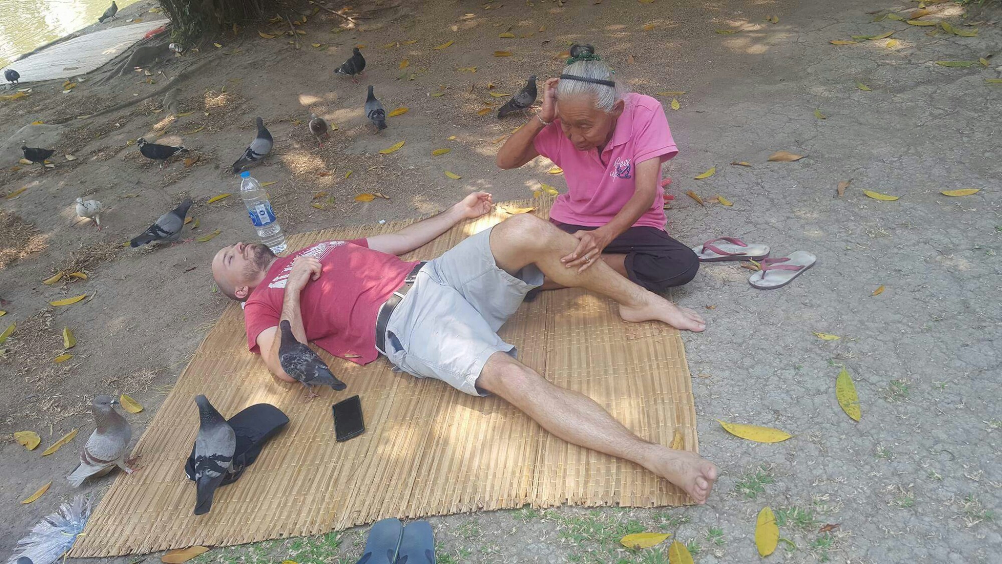 The last days in Chiang Mai were lazy days. As Jeanette loves to walk we did a good bit of walking this morning. Public toilets are hard to come by sometimes so we ended up on a fast sprint to the nearest park (which we’ve learned usually have paid public restrooms). After paying our 6 baht and using the restroom, the lady who sells you toilet paper asked if we wanted a massage (150 baht). We didn’t really have any reason to decline so we said sure. She got a mat and picked a spot in the park by the pond. I sat and read while Jeanette got hers. Then when it was my turn Jeanette decided to buy fish food and ended up befriending the pigeons and feeding them on my back.