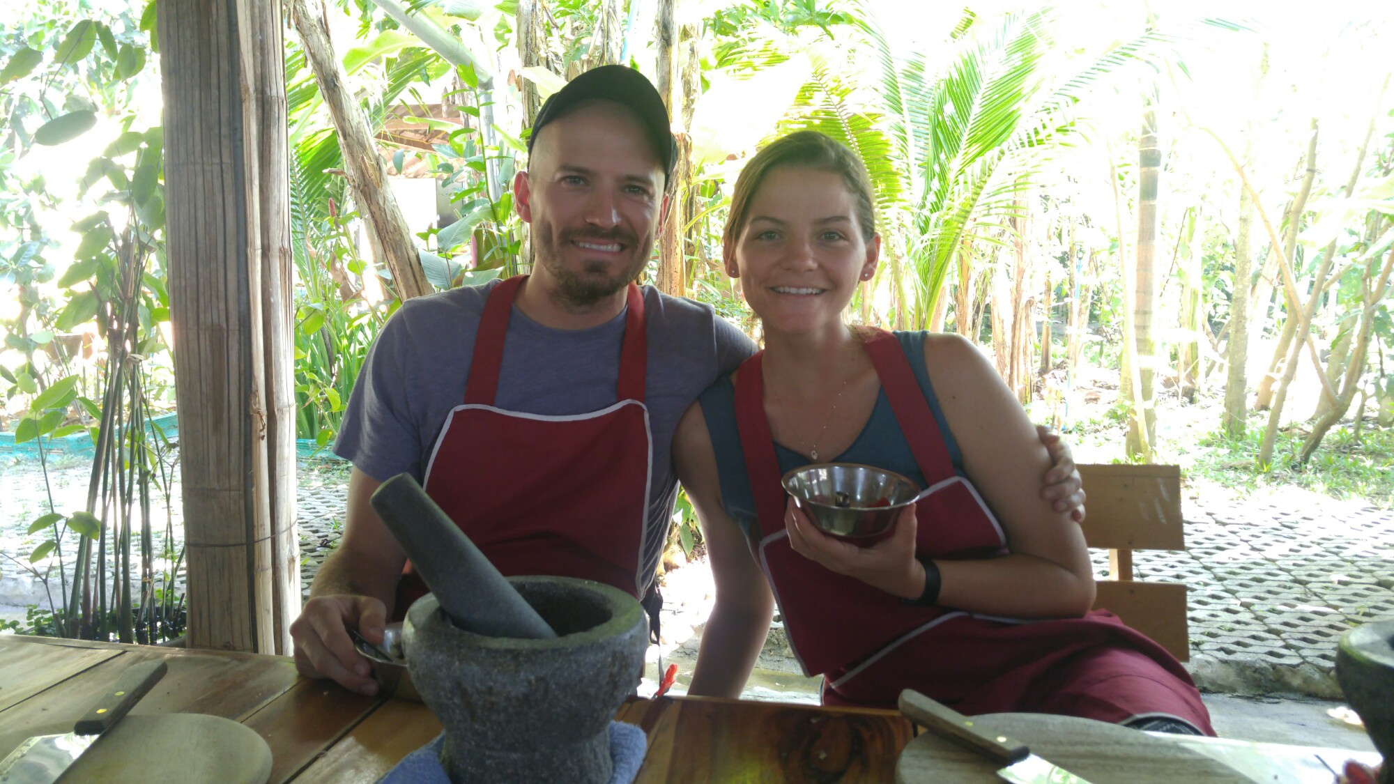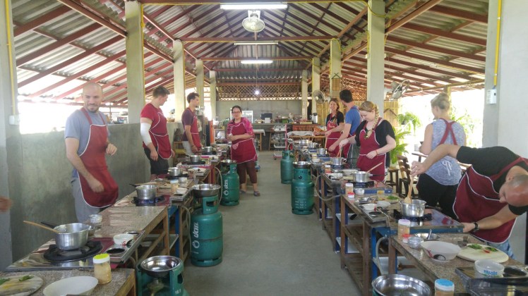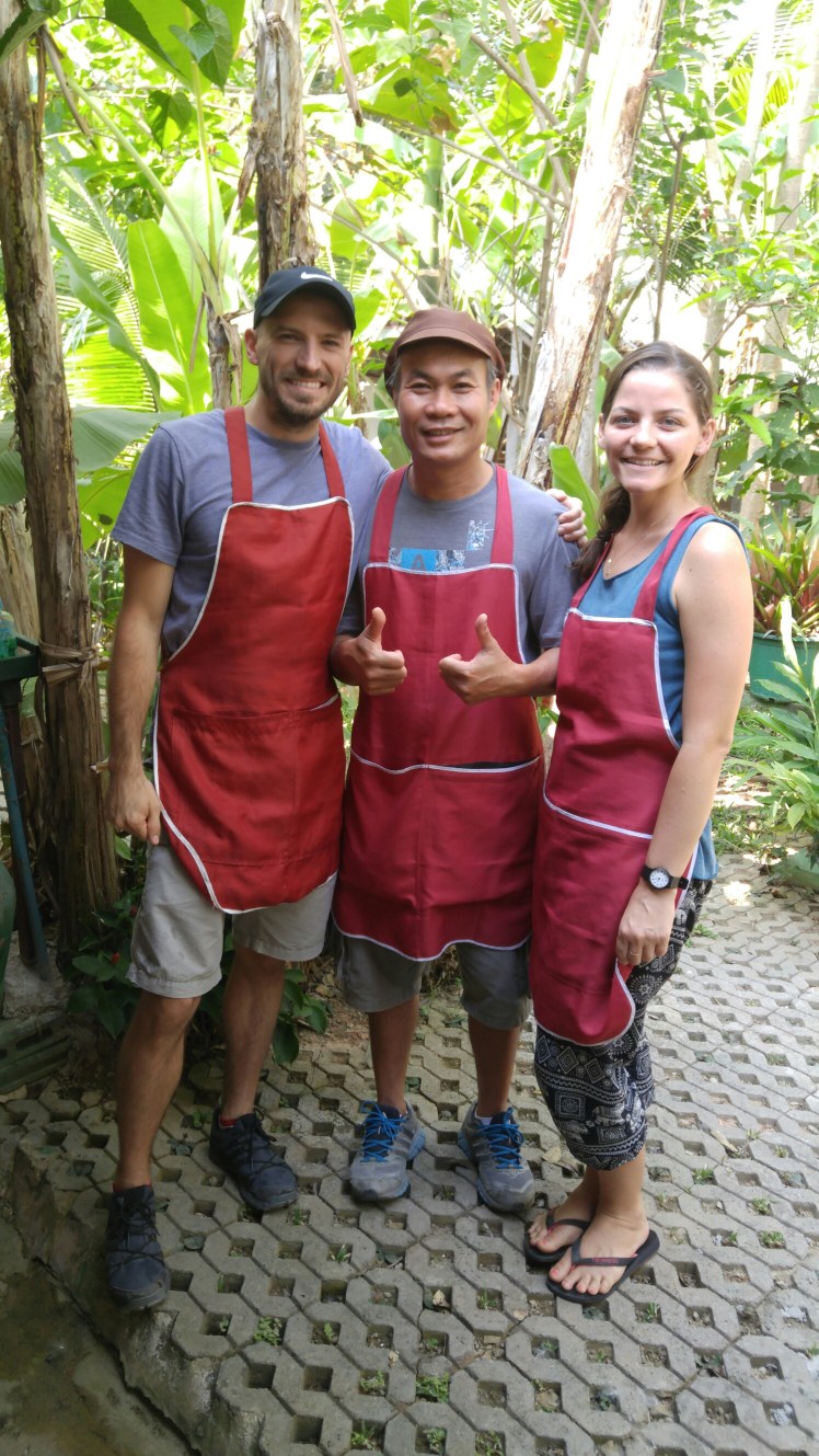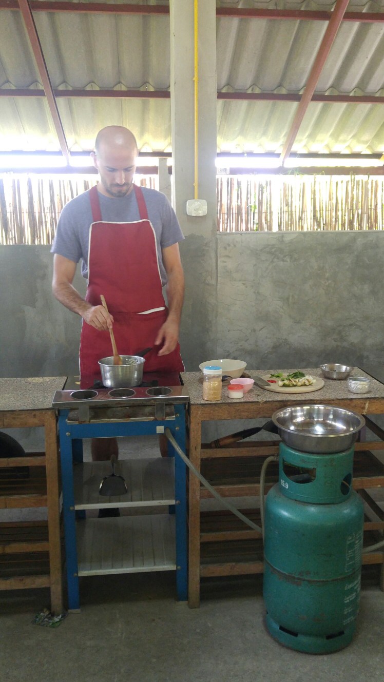 Our fourth day in Chiang Mai we signed up for a 6 hour cooking course. This is another of those top of the list things to do in the area, and they run about $35 per person. We specifically chose one that was outside of the city so that we could experience a bit of the countryside. Sammy, the chef and our teacher picked us (and others) up at our hostels and took us to a local produce market where some of the ingredients were purchased. Then we drove about 30 minutes outside of the city. His land, farm, garden and home were all beautiful. Many of the herbs he grows in his garden so we got an explanation and tasting of those which was neat and insightful and then we began to cook. We were going to learn 5 dishes: an entree, side dish, soup, appetizer and a dessert and under each category there were a few options we could chose from. I chose to learn red curry, stir fried veggies, and coconut chicken soup while Jason chose green curry, pad thai and vegetable soup. We chose different things so we could try more.