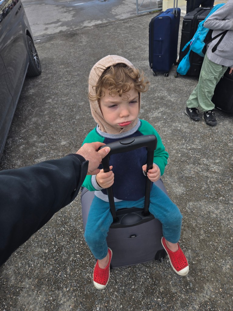 Isaac off the ferry. We are finally in Syros.