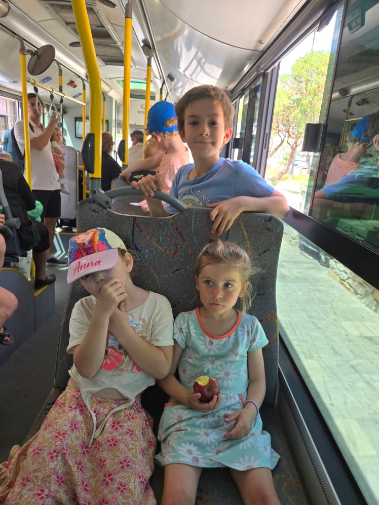 There’s one other bus system that loops the entire island. It takes just over an hour and costs 2 Euro per person 5 and up. It’s a great way to see the coastline. This day we got off at Gallissas Beach.
