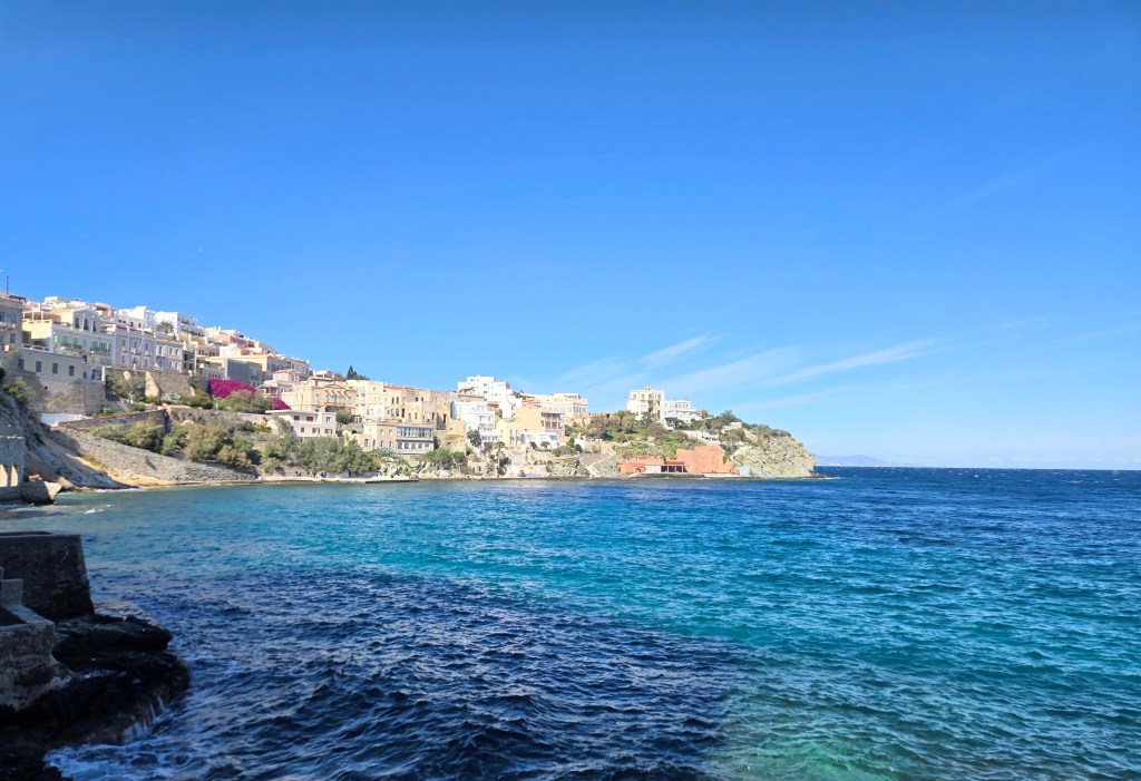 Figuring out public transportation is always a favorite of ours. There is a free ‘mini bus’ that has 3 routes around the main city Ermoupolis. Our Argentinian friends pictured here, shy away from no adventure so they’ve been fun to travel with.